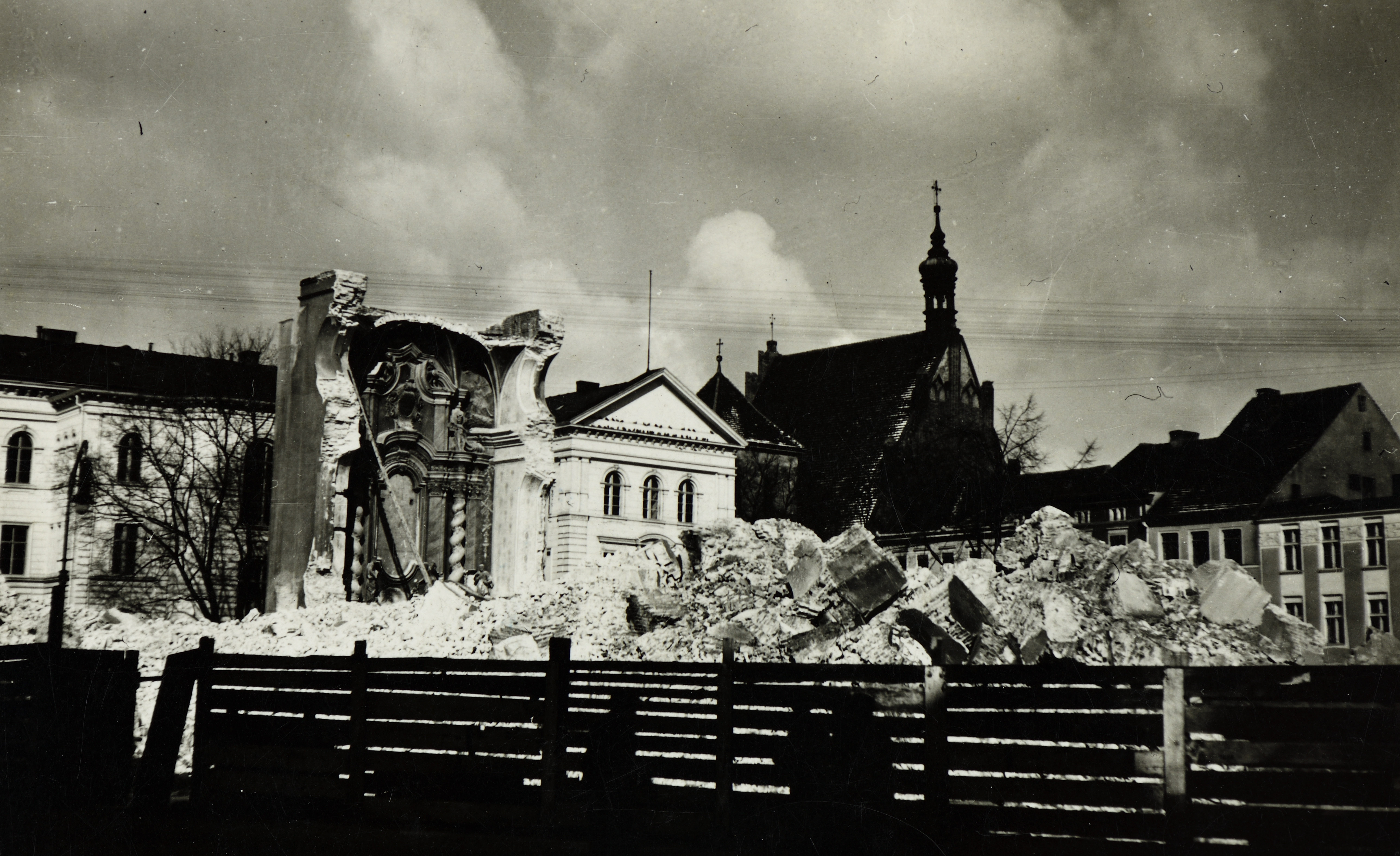 (…) Był już przerażającą ruiną, gdy na rozkaz władz sfotografowano go, a zdjęcie opublikowano w całej Rzeszy jako świadectwo brytyjskiego barbarzyństwa. Anglicy bombardują kościoły! (na zdjęciu dowód niezbity.) Tymczasem kościół się bronił. W swoich dolnych partiach mury okazały się tak potężne, że jeszcze latam 1940 trudzono się rozszarpywaniem budowli. Na próżno. Wówczas wezwano na pomoc Technische Nothilfe. Ta wysadziła resztki 19 VIII 1940. Być może warto zachować dla potomności nazwisko człowieka, który operacją kierował: regierungsbaurat Reimer. Kto by sądził, że po dokonaniu tego dzieła miasto otrzymało nowy ratusz, bardzo by się pomylił. Nie ma go do dziś. Pamiątką po kościele Św. Ignacego jest wizerunek Najświętszej Marii Panny, wyjęty z ołtarza, ocalony podczas wojny, obecnie w kościele Św. Piotra i Pawła na pl. Wolności.