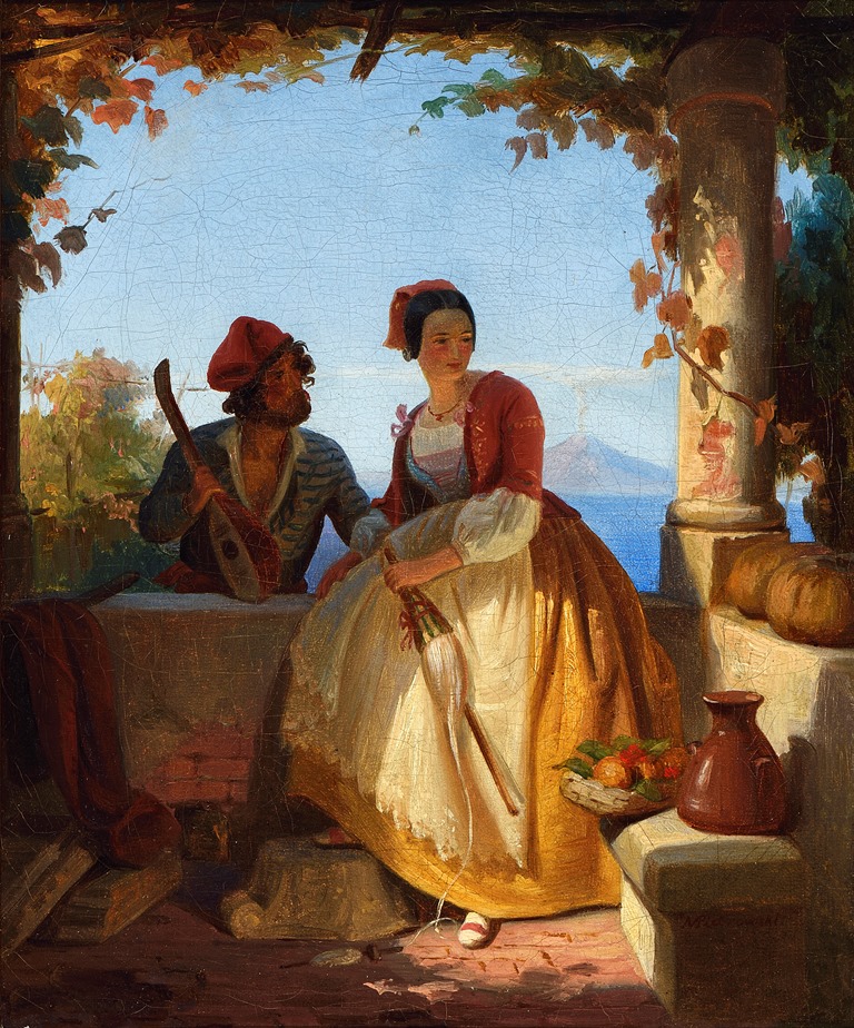 Tytułowa scena rodzajowa została osadzona w południowym, śródziemnomorskim krajobrazie w miejscowości Sorrento. W tle kompozycji artysta ukazał błękitne morze, a na horyzoncie namalował dymiący wulkan przypominający Wezuwiusz.