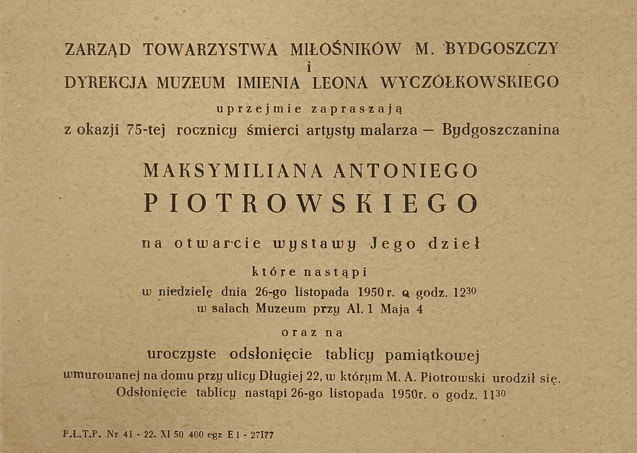 Z okazji 75. rocznicy śmierci bydgoszczanina Maksymiliana Antoniego Piotrowskiego, z inicjatywy Towarzystwa Miłośników Miasta Bydgoszczy 29 listopada 1950 o godz. 11.30 odsłonięto tablicę pamiątkową, którą wmurowano w elewację kamienicy przy ulicy Długiej 22 w Bydgoszczy. To w tej kamienicy 8 czerwca 1813 urodził się i spędził pierwsze lata życia M.A. Piotrowski. Odsłonięcia tablicy dokonał Kazimierz Maludziński – przewodniczący Prezydium Miejskiej Rady Narodowej w Bydgoszczy.